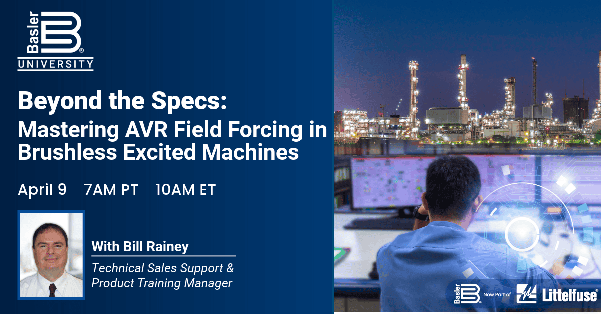 Join Bill Rainey, Basler’s Technical Sales Support & Product Training Manager, April 9 for Basler University’s live webinar: Beyond The Specs: Mastering AVR Field Forcing in Brushless Excited Machines.